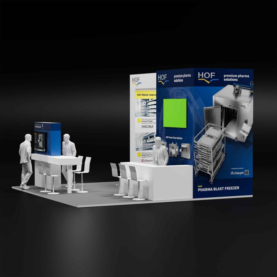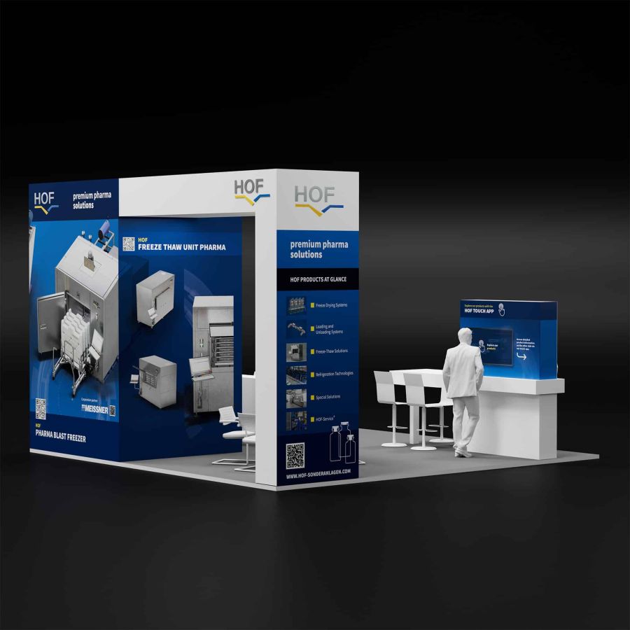 Für den Auftritt der HOF Sonderanlagenbau GmbH auf der Interphex in New York entwickelten wir ein modulares Messekonzept mit klarem Fokus auf Technologie, Interaktion und visuelle Qualität. Im Zentrum stand ein flexibel skalierbares Standdesign, das wir inklusive Material- und Lichtstudien als fotorealistische 3D-Renderings aufbereiteten.